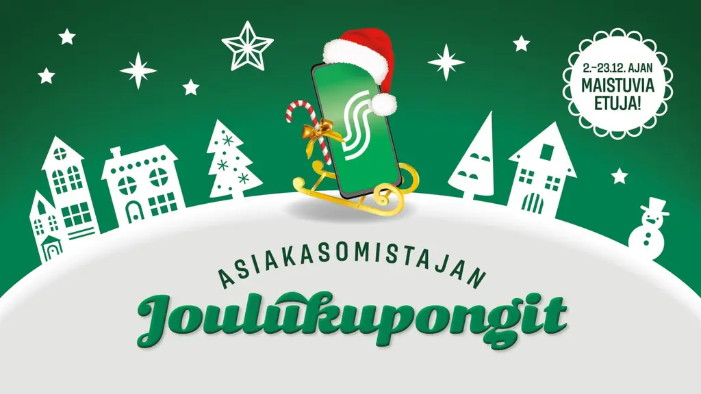 Hyvää joulun odotusta Sinulle asiakasomistaja! Käy kurkkaamassa S-mobiilista joulukuponkimme, joilla saat maistuvia etuja ympäri Kymenlaaksoa!Katso kaikki edut!
