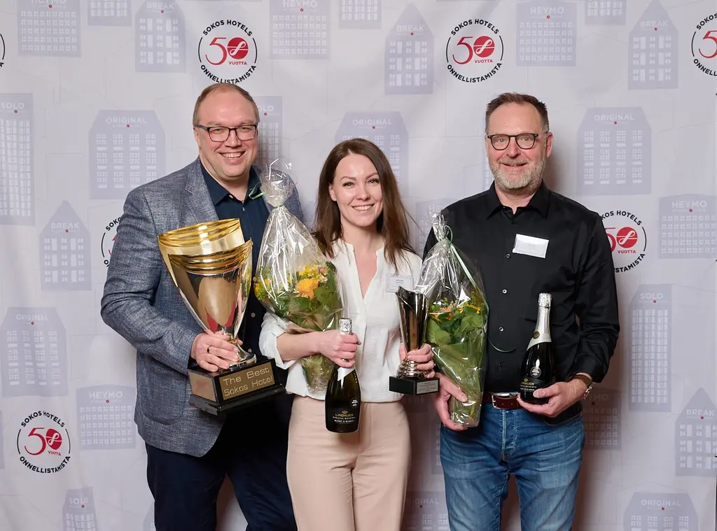 S-ryhmän Matkailukaupan päivillä palkittiin Sokos Hotellien loistavien työntekijöiden parhaimmistoa. Palkitsemisen kriteereissä painottuivat asiakaskokemus, työntekijäkokemus ja kehitys edellisestä vuodesta. Myös vastuullisuuden eteen tehdyn työn merkitys majoitustoimialalla kasvaa koko ajan, ja tänä vuonna palkittiinkin ensimmäistä kertaa Vuoden vastuullisuusteko Sokos Hotelleissa.– Erityismaininnan ansaitsee vuoden hotelli Original Sokos Hotel Vaakuna Kouvolassa, jonka erinomaisesti läpiviety uudistus on nostanut pinkin kaunokaisen uuteen nousuun kaikilla mittareilla. Paljon onnea Pasi Pekkaselle tiimeineen, kiittää matkailukaupan konsepteista ja kehityksestä vastaava johtaja Jaana Matikainen SOK Matkailu- ja ravitsemiskaupan ketjuohjauksesta.– Meillä Vaakunassa on aivan erityinen tunnelma ja palava halu tuottaa unohtumattomia elämyksiä. Vaakunan kaikki työntekijät, ja mikä parasta myös asiakkaamme, rakastavat hotelliamme. Tavoitteemme onkin aina sekä tyytyväinen asiakas että henkilökunta, ja onnellistamme yhtä lailla molempia. Matkailu- ja ravitsemiskaupan myyntipalvelun Johanna Salosen henkilökohtainen Vuoden Onnellistaja -palkinto on upea huomionosoitus onnellistamistyöllemme. Pakahdumme kaikki ylpeydestä, että saamme olla osa vuoden Sokos Hotellia! Hotellin johtaja Pasi Pekkanen iloitsee.Hotellien johtaja Pasi Pekkanen, hotellipäällikkö Noora Heikkinen ja toimialajohtaja Mikko Virtanen iloitsevat KSO:n menestyksestä.